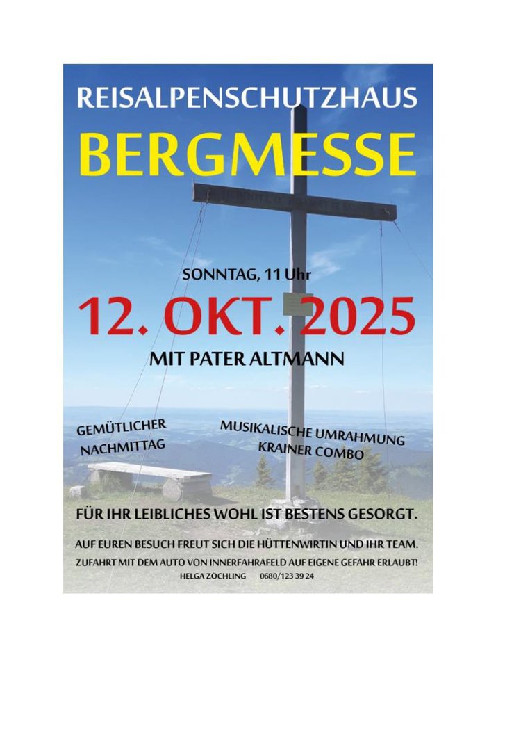 Sonntag, 12. Oktober: 11h Bergmesse Reisalpenschutzhaus mit anschließendem Frühschoppen